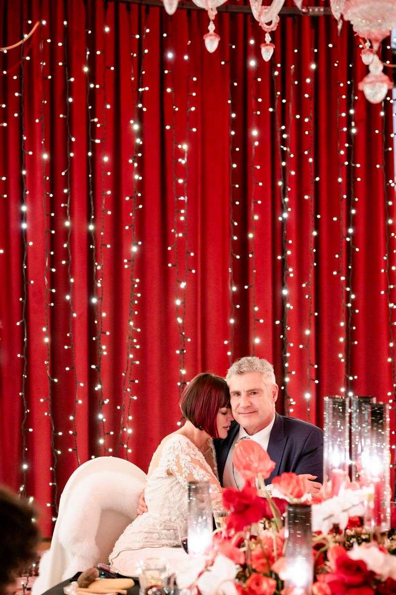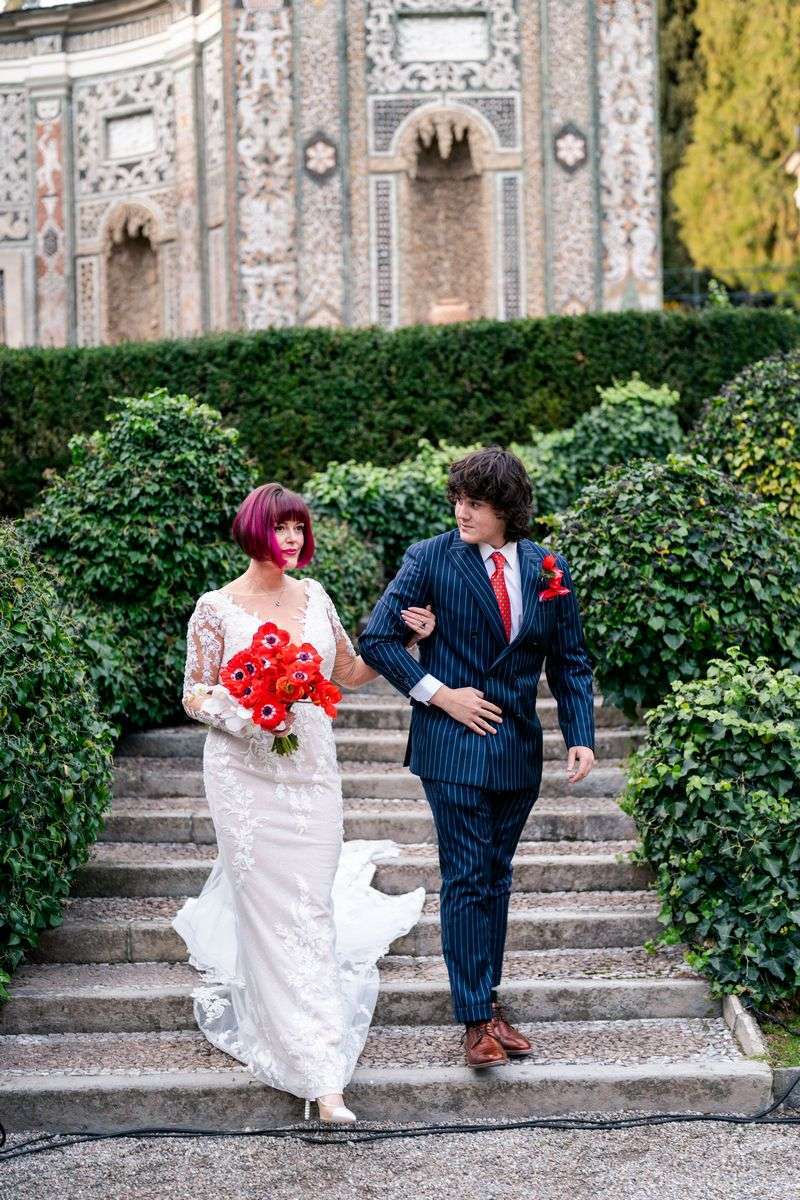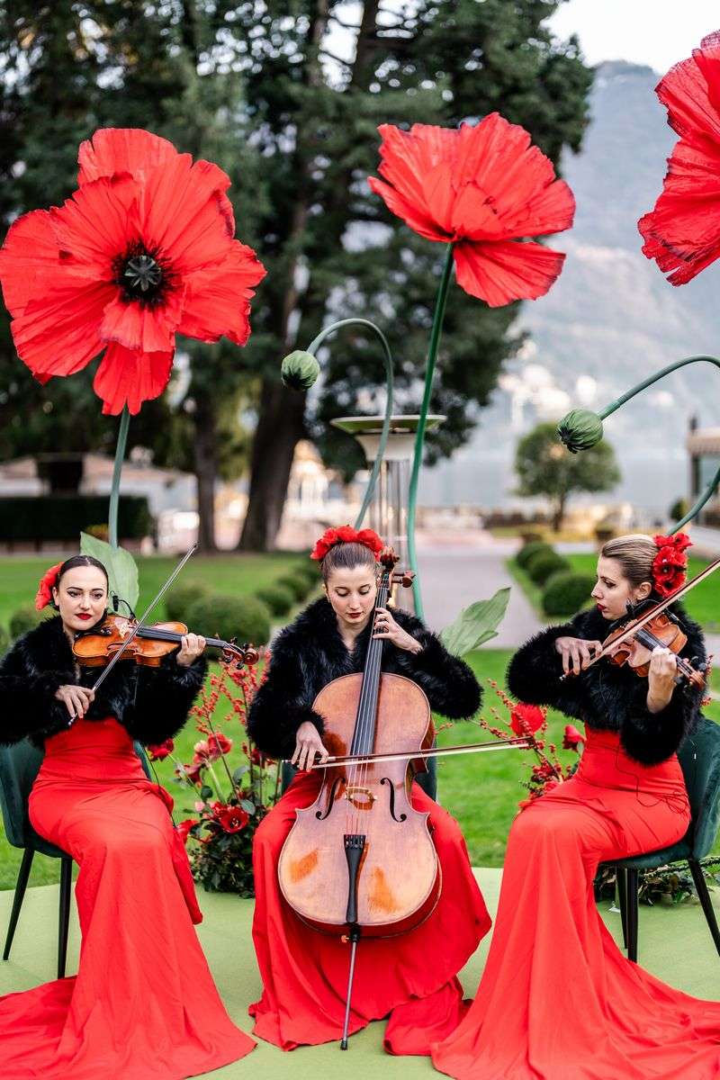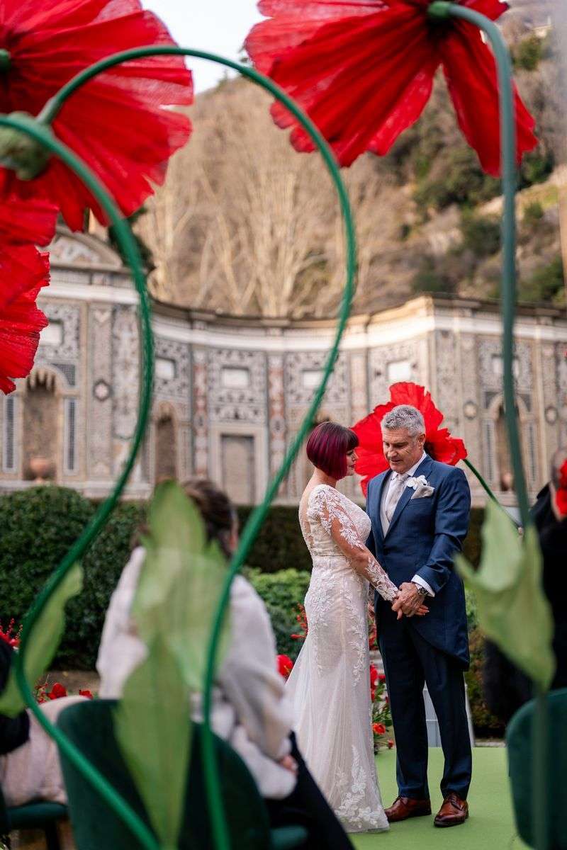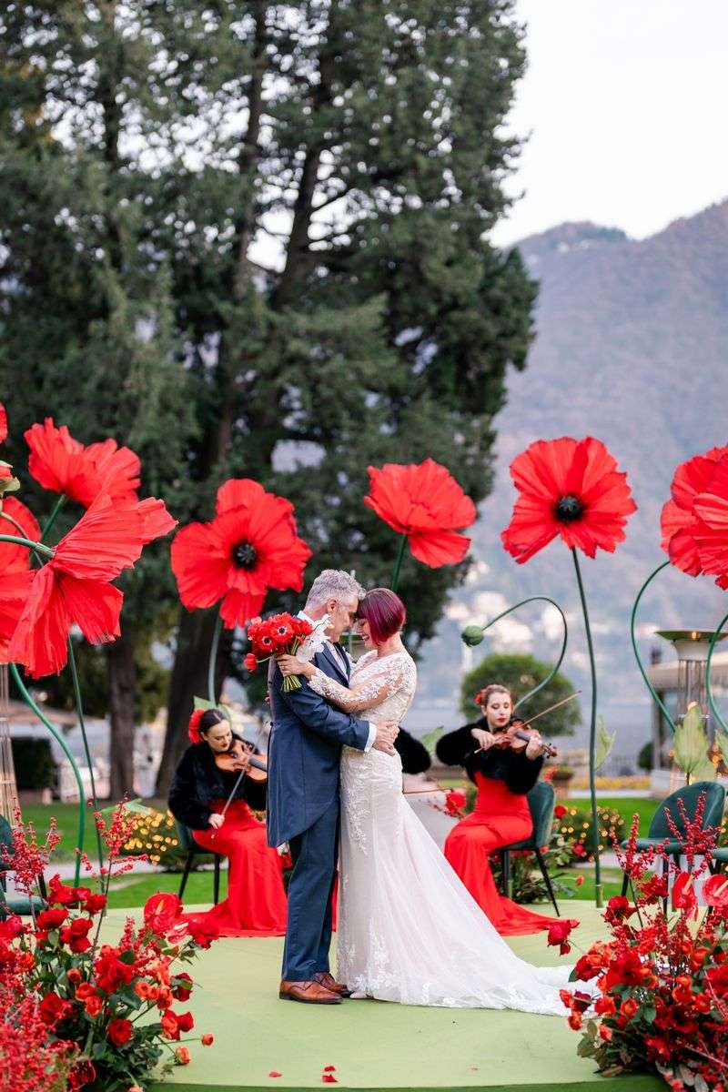 Ivory and Jason immediately showed themselves to be very much in love, passionate about art and sensitive to the symbolic meanings that every detail can hold. Nothing was left to chance on their big day; rather, each element narrated their unique story. Within the sumptuous setting of Villa d’Este, the color red dominated the scene, imbuing every moment with passion and intensity. From the majestic handcrafted silk poppies that adorned the ceremony with their dramatic presence to the flowers meticulously arranged by The Blonde Flower, perfectly matched to the attire of the enchanting violinists. Despite the bold choice of red, the result was anything but overbearing. Instead, the atmosphere was pervaded by an unparalleled refined elegance.