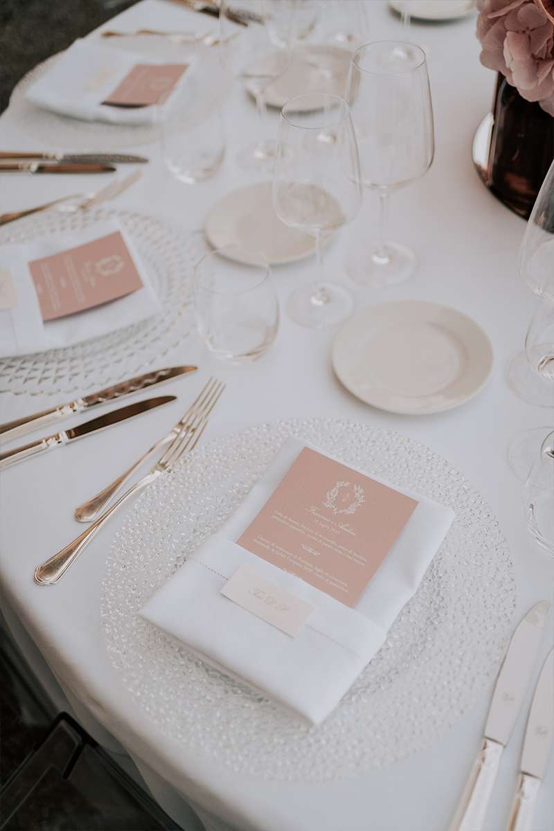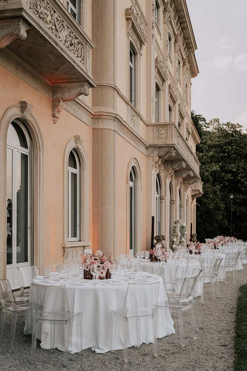 The reception was held at Villa del Grumello, where the tables were beautifully adorned with pastel orange flowers, creating a soft and romantic ambiance that complemented the natural beauty of the villa.